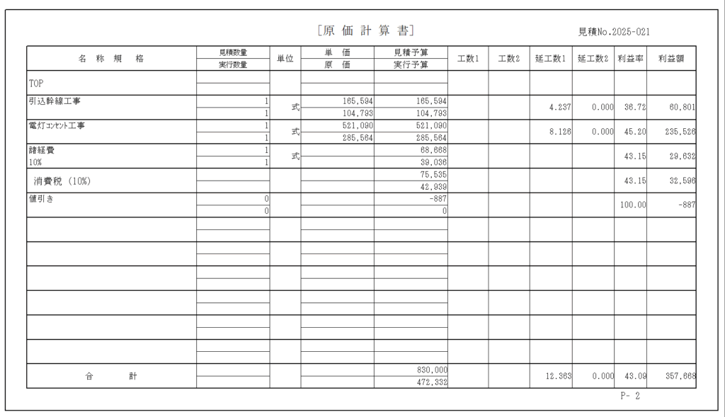 各材料の原単価を設定することで、利益額を自動で計算します。それにより見積書・請求書と合わせて、原価計算書を作成することが可能です。原価・単価を同時に確認する場合にも活用できます。