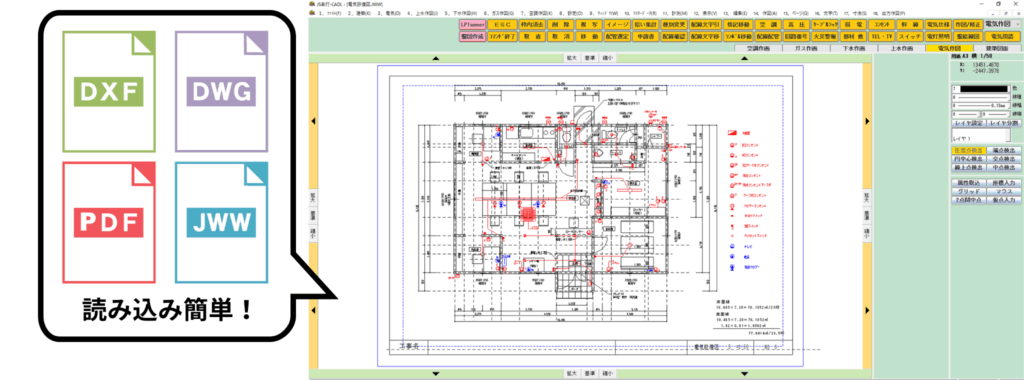 DXF・JWW・JWC・DWG・SXF・SFC ファイルの読み込み、書き出しに対応しています。